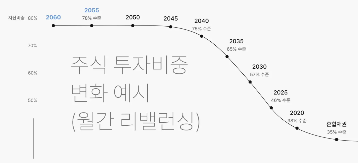 2060년 은퇴를 가정할 경우 현 시점에서는 위험자산인 주식 비중을 높게 가져가지만, 은퇴시점이 다가올수록 점진적으로 주식 비중을 낮추고 안전자산인 채권 비중을 높이는 방식으로 운용됩니다. 이러한 자산배분 조정은 매년 6월에 정기적으로 이뤄집니다.