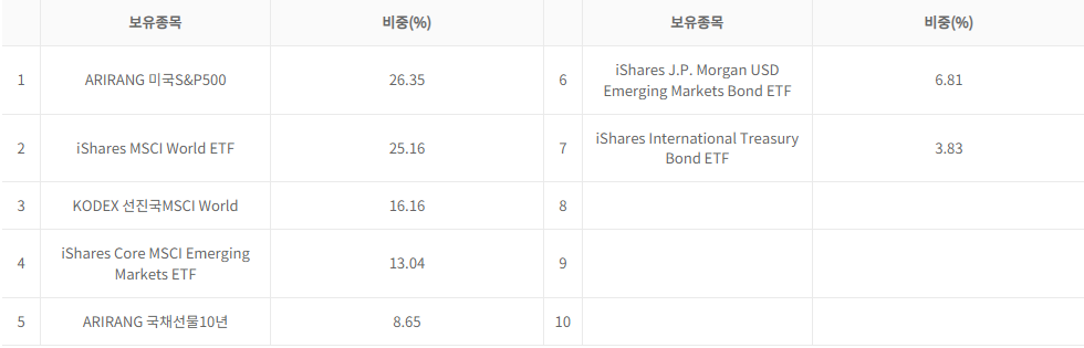 주요 투자 종목을 살펴보면 전세계 주식시장을 아우르는 ETF들과 국내외 채권 ETF가 골고루 편입되어 있음을 알 수 있습니다. 글로벌 분산투자를 통해 안정적인 포트폴리오 운용을 지향하고 있다고 볼 수 있겠네요.