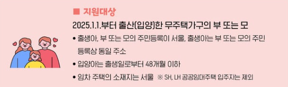 - 지원 대상: 2025.1.1. 이후 출산 또는 입양한 무주택가구의 아동