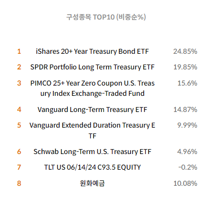 듀레이션이 긴 다양한 미국 초장기 국채 ETF에 주로 투자하고 있으며, 이를 통해 금리 하락에 따른 자본차익과 높은 이자수익을 동시에 추구하는 것으로 보입니다.