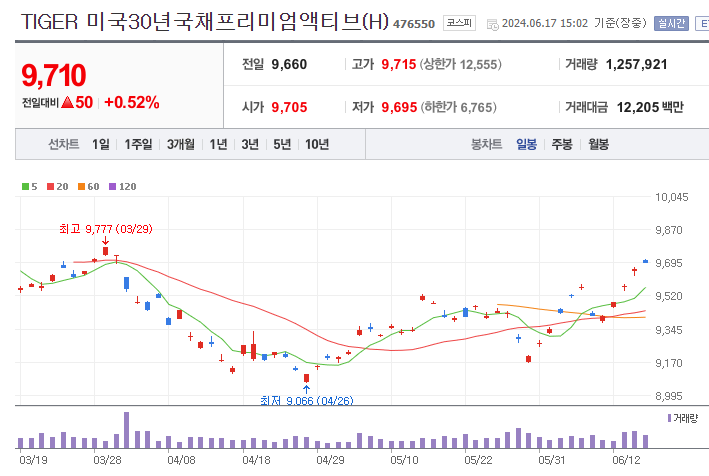 TIGER 미국30년국채프리미엄액티브(H)는 총 4,802억원 규모의 해외채권형 ETF입니다. 1주당 가격은 52주 기준 최고 10,210원, 최저 9,170원을 기록 중입니다.